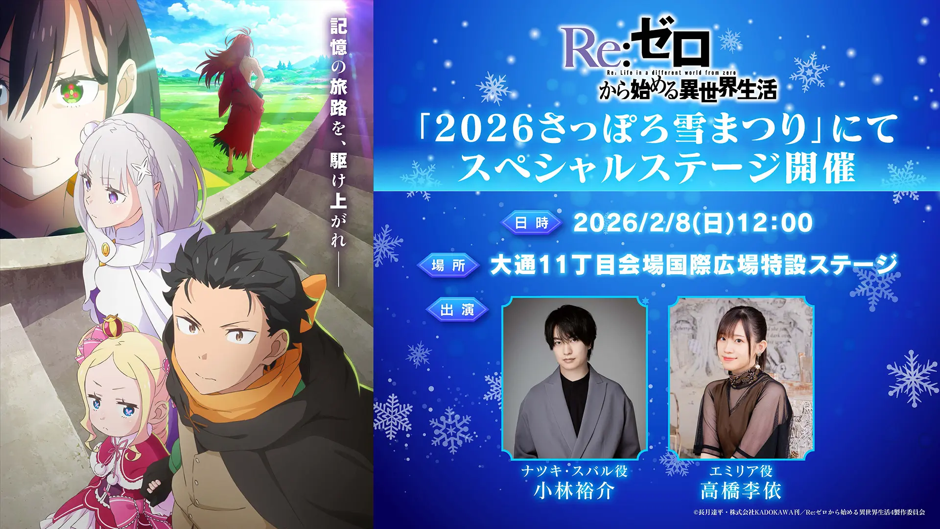 北海道札幌市の大通公園などで開催される、雪と氷の祭典「さっぽろ雪まつり」に、今年もTVアニメ「Re:ゼロから始める異世界生活」の参加が決定いたしました。今年はスバル&エミリアのTVアニメ10周年を記念した雪像が登場! さらに本日、雪まつり描き下ろしビジュアルも公開!こちらのグッズも販売予定となりますので、ぜひ続報をお楽しみに。
