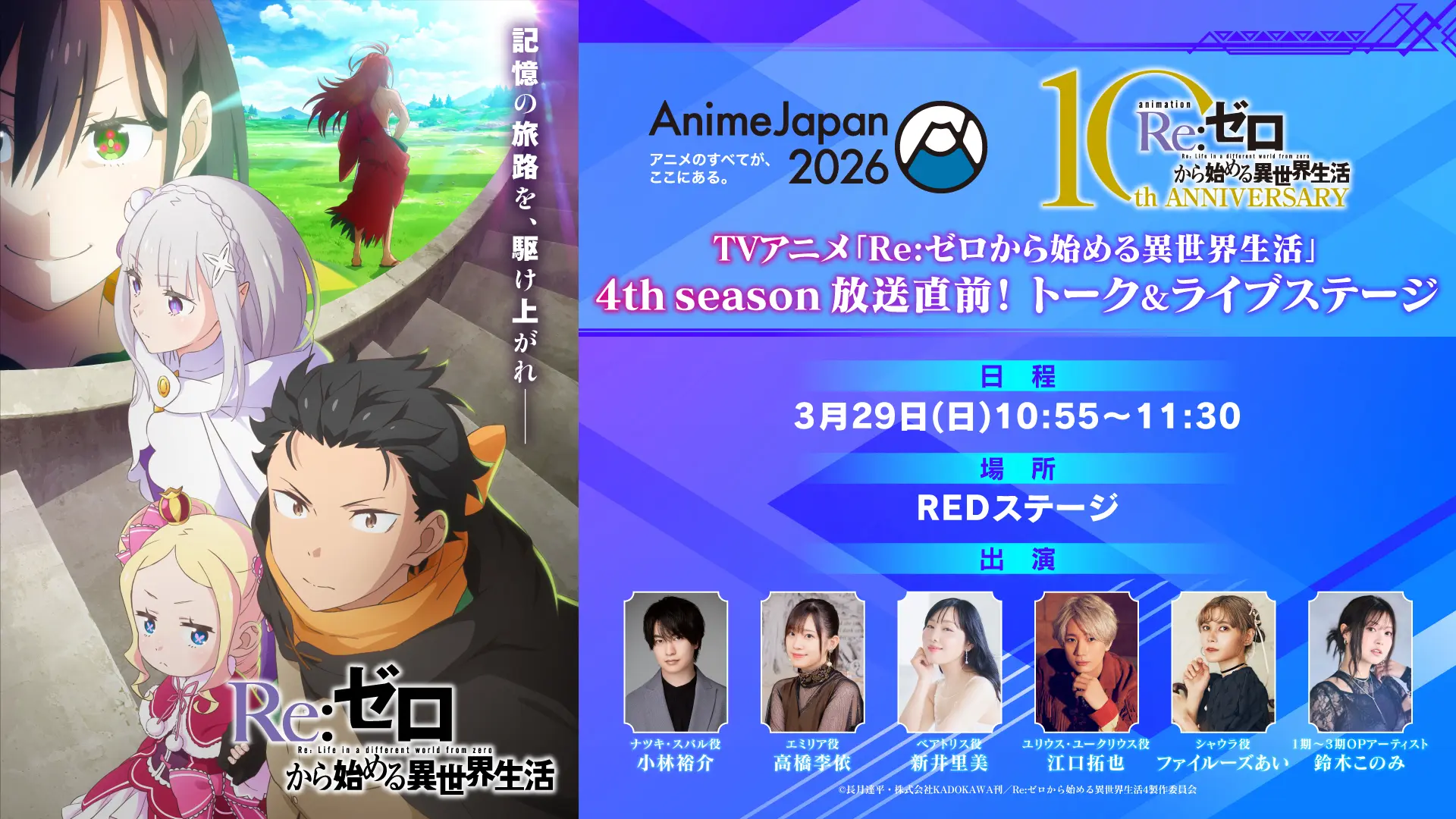 | 出演 | 高橋李依(エミリア役)、新井里美(ベアトリス役)、 植田佳奈(アナスタシア・ホーシン役)、ファイルーズあい(シャウラ役) 鈴木このみ(1期~3期OP主題歌アーティスト) |